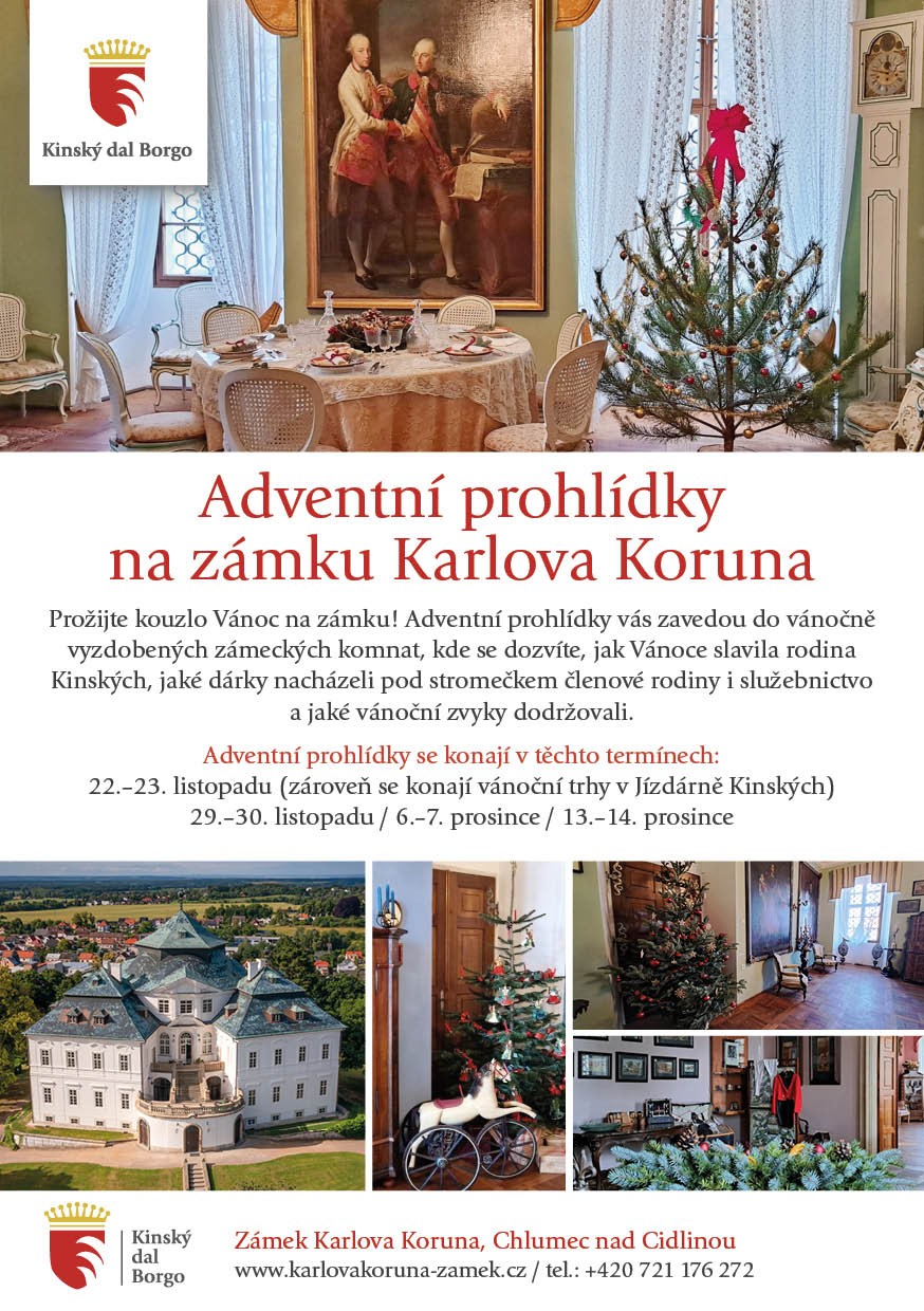 V letošním roce jsme pro vás připravili jedinečnou možnost prožít kouzlo Vánoc v prostředí barokního zámku Karlova Koruna. Adventní prohlídky vás zavedou do vánočně dekorovaných zámeckých prostor, kde se dozvíte více o tom, jak slavila Vánoce šlechtická rodina Kinských.